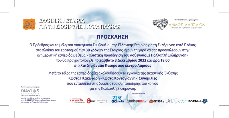 Ο Πρόεδρος και τα μέλη του Διοικητικού Συμβουλίου της Ελληνικής Εταιρίας για τη Σκλήρυνση κατά Πλάκας, στο πλαίσιο του εορτασμού των 30 χρόνων της Εταιρίας, πραγματοποιούν ενημερωτική εσπερίδα με θέμα: «Oλιστική προσέγγιση του ασθενούς με Πολλαπλή Σκλήρυνση», το Σάββατο 3 Δεκεμβρίου 2022 και ώρα 18:00 στο Χατζηγιάννειο Πνευματικό κέντρο Λάρισας, με την αιγίδα της Αντιδημαρχίας Πολιτισμού & Επιστημών Δήμου Λαρισαίων.