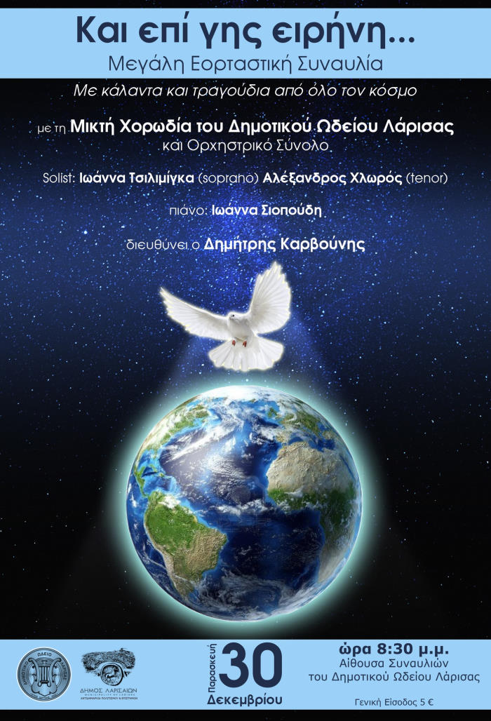 Ένα γιορταστικό μουσικό οδοιπορικό με τραγούδια απ’ όλο τον κόσμο περιλαμβάνει η μεγάλη εορταστική συναυλία που θα δώσει η Μικτή Χορωδία του Δημοτικού Ωδείου Λάρισας, με τη συμμετοχή ορχηστρικού συνόλου, στο οποίο συμμετέχουν δεκαπέντε εξαίρετοι μουσικοί της πόλης μας.