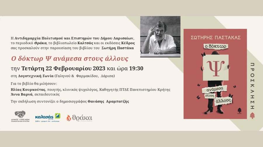 Η Αντιδημαρχία Πολιτισμού και Επιστημών του Δήμου Λαρισαίων, το περιοδικό Θράκα, το βιβλιοπωλείο Καλτσάς και οι εκδόσεις Κέδρος, διοργανώνουν την παρουσίαση του βιβλίου του Σωτήρη Παστάκα "Ο δόκτωρ Ψ ανάμεσα στους άλλους", την Τετάρτη 22 Φεβρουαρίου 2023 στις 19:30 στη Λογοτεχνική Γωνία (Γαληνού & Φαρμακίδου, Λάρισα).