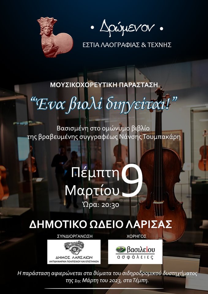 «Ένα βιολί διηγείται!» είναι ο γενικός τίτλος της νέας θεματικής παράστασης που διοργανώνει το «Δρώμενον - Εστία Λαογραφίας και Τέχνης», σε συνεργασία με την Αντιδημαρχία Πολιτισμού και Επιστημών του Δήμου Λαρισαίων, την Πέμπτη 9 Μαρτίου 2023 στις 20:30 στο Δημοτικό Ωδείο Λάρισας.