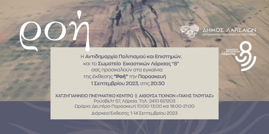 Η έκθεση με τίτλο «Ροή» πραγματοποιείται από το Σωματείο Εικαστικών Λάρισας «8» σε συνδιοργάνωση με την Αντιδημαρχία Πολιτισμού και Επιστημών Δήμου Λαρισαίων.