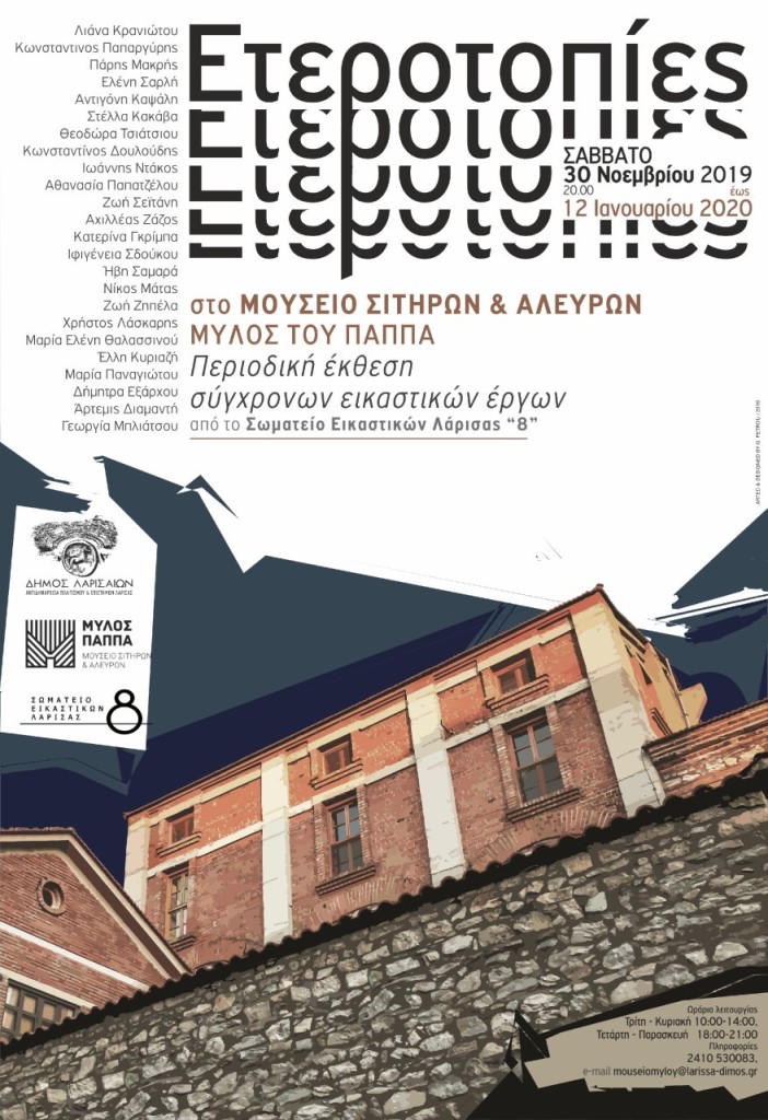 Το Μουσείο Σιτηρών και Αλεύρων και το Σωματείο Εικαστικών Λάρισας “8” διοργανώνουν ανοιχτή ξενάγηση στην περιοδική εικαστική έκθεση “Ετεροτοπίες” την Πέμπτη 9-1-2020, στις 19:00.
