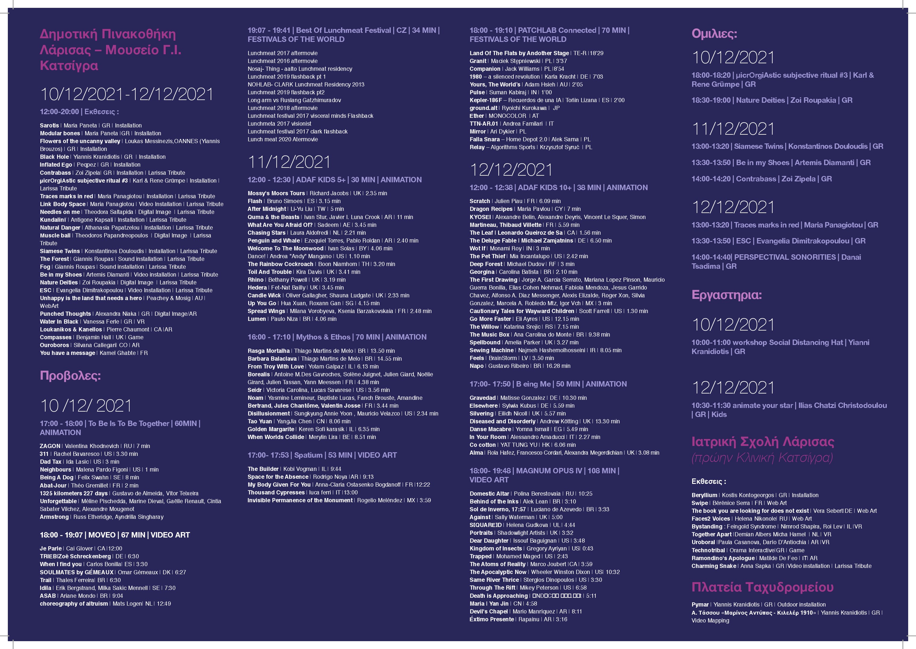 Η Δημοτική Πινακοθήκη Λάρισας – Μουσείο Γ.Ι. Κατσίγρα είναι ένας πολιτιστικός οργανισμός προώθησης και προβολής των εικαστικών τεχνών πανελλαδικής εμβέλειας. Ιδρύθηκε το 1983, έπειτα από τη δωρεά της Συλλογής του αείμνηστου ιατρού και συλλέκτη Γεωργίου Ι. Κατσίγρα προς τον Δήμο Λαρισαίων το 1981. Το Athens Digital Arts Festival (ADAF) εκπροσωπεί τη χώρα μας διεθνώς και αποτελεί σημείο σύγκλισης όλων των μορφών και τάσεων του σύγχρονου ψηφιακού πολιτισμού. Στοχεύει στην ανάδειξη των πολλαπλών τρόπων με τους οποίους η τέχνη επικοινωνεί με την τεχνολογία καθώς και της επίδρασης αυτής της σχέσης στη σύγχρονη καθημερινότητα της μεγάλης πόλης και τον άνθρωπο. Παράλληλα, ενισχύει την επαφή και την εξοικείωση του ευρέως κοινού με τα νέα μέσα και την ψηφιακή κουλτούρα.